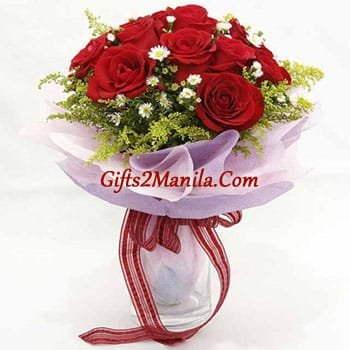 Creating a blazing deep rep, this special hand bouquet of 12 red roses and white phoenixes don’t only serenade, but make a statement.