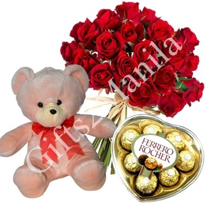 The classic romance of a 2 dozen red roses with 18inches stuff toys and ferrero heart can say so many things, from “I love you!” to “I’m sorry.” Stunning in its simplicity, this elegant arrangement of deep combo gift.