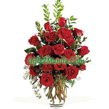 18 stems of dutch red roses arrange in clear glass vase with lots of green fillers.