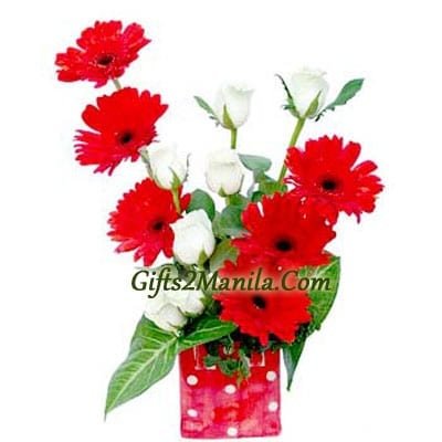 This arrangement in a square container consists of 7 White Roses along with 6 Red Gerberas arranged elegantly to look so different.