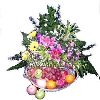 Bathe your eyes and your lips in this refreshing arrangement of pink lilies and roses atop a basket of fresh fruits.
