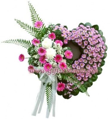 This magnificent wreath offers a heartfelt expression of sympathy. Heart-shaped wreath is composed of lavender Malaysian mums along with pink gerberas.