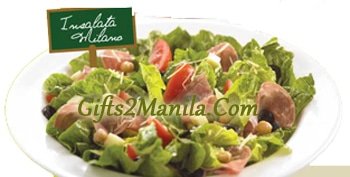 Insalata Milano.Salami Milano, mozzarella, black olives, tomatoes, garbanzos, romaine, Parmesan cheese and Italian vinaigrette.