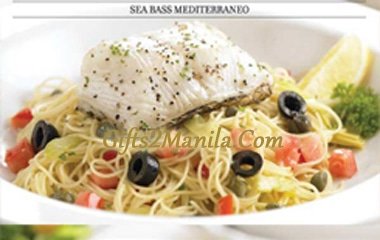 Sea Bass Mediterraneo .Angel hair pasta sauteed in butter, olive oil, black olives, capers and tomatoes, crowned with a pan-fried sea bass fillet.