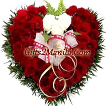 Send on this Valentine this beautiful heart arrangement of fifty red roses & some white roses in a the middle with curling ribbons.