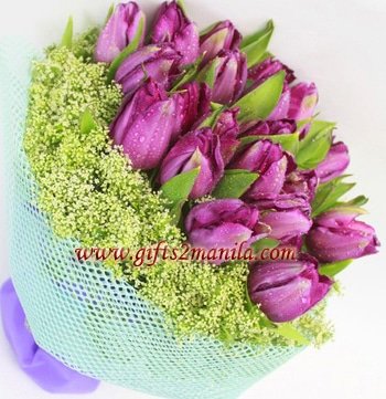 this Beautiful18 purple tulips are arranged in a bouquet with a pretty matching wrapper.