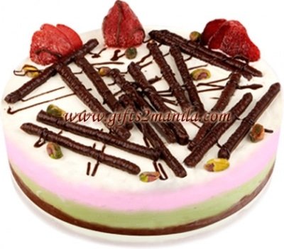 Pistachio, Strawberry Supreme and Vanilla gelato layers on crushed graham and rice crispies covered with barquillos, strawberry slices and pistachio nuts