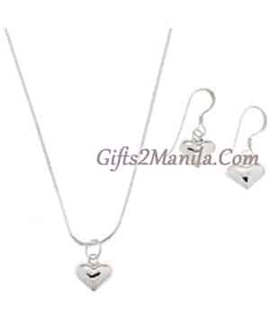 The sterling silver set displays polished puffed hearts dangling from drop earrings and a pendant. A shimmering 18-inch snake chain with a lobster clasp accompanies the pendant. Euro wires secure the earrings.