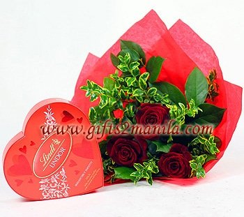 Give a bouquet of three red roses with a heart shaped box of luxurious Lindt Lindor Swiss chocolates. A truly traditional gift to show your love on Valentines Day.