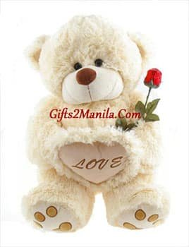 A Beautiful soft cuddly teddy bear holding a artificial rose. The bear comes with a heart embroidered with the word “Love”.