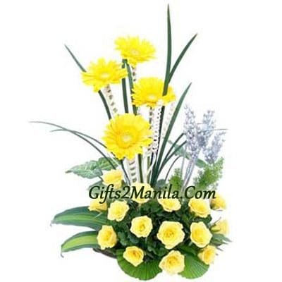 Contemporary arrangement of 4 Yellow Gerberas & 15 Yellow Roses along with silver dry sticks in a flat round basket.